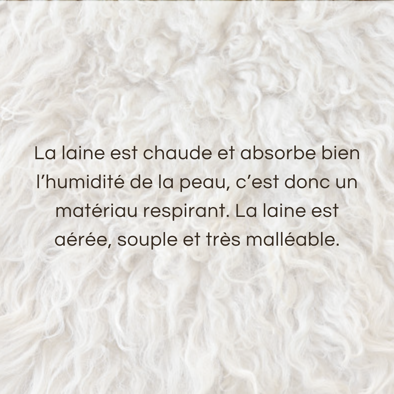 La laine est chaude et absorbe bien l’humidité de la peau, c’est donc un matériau respirant. La laine est aérée, souple et très malléable. La fibre de laine est écailleuse, bouclée et flexible et est chaude même lorsqu'elle est mouillée.