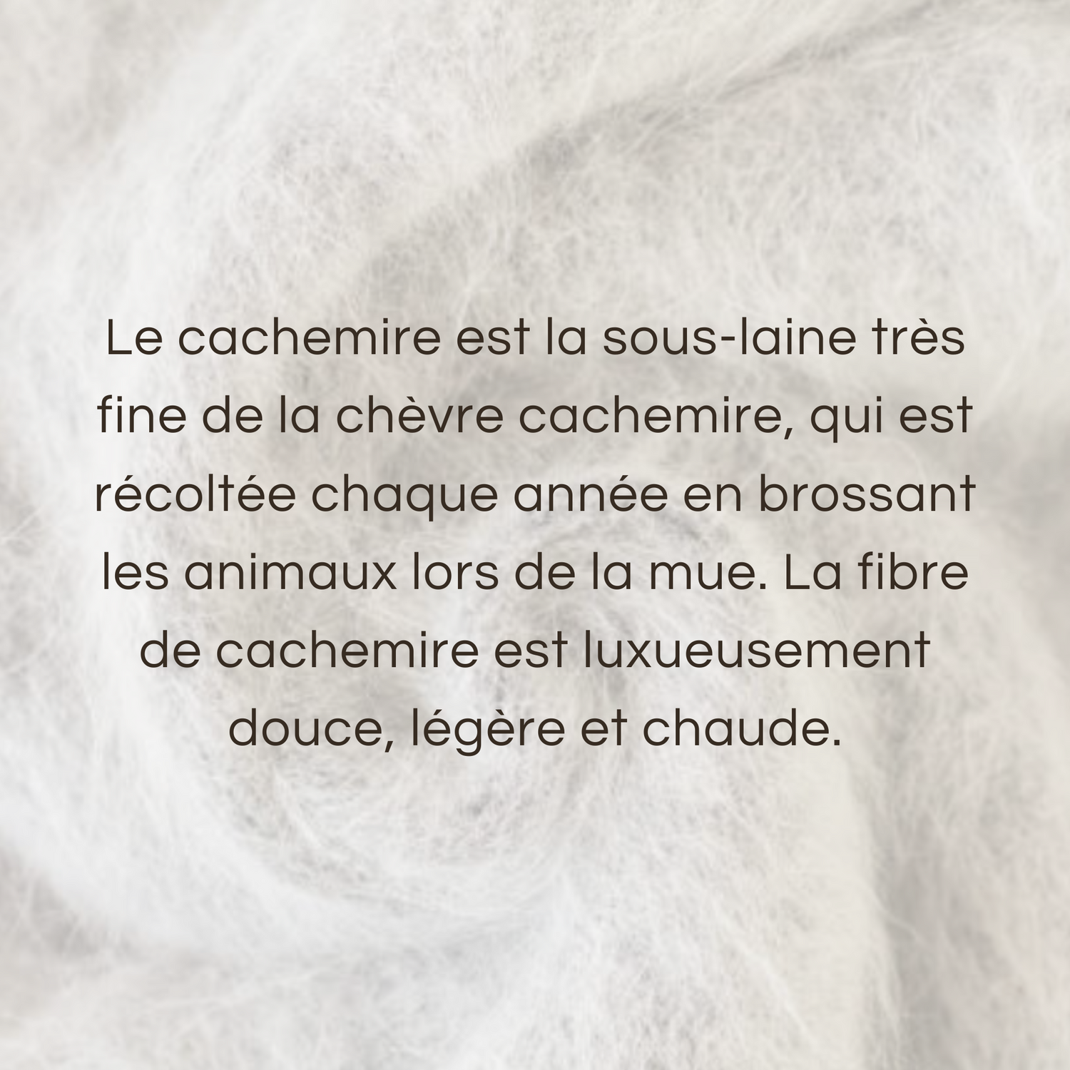 Le cachemire est la sous-laine très fine de la chèvre cachemire, qui est récoltée chaque année en brossant les animaux lors de la mue. La fibre de cachemire est luxueusement douce, légère, chaude et chère.