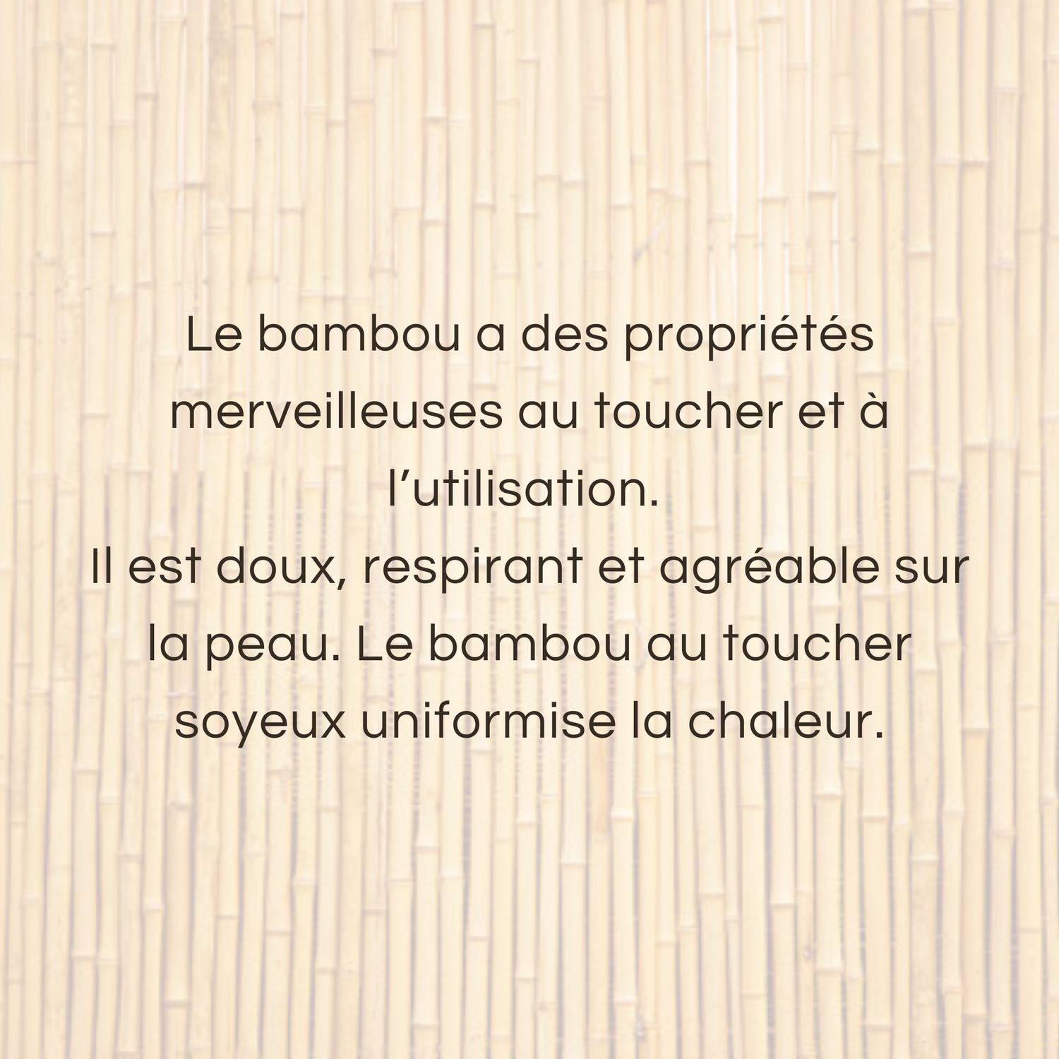 Le bambou a des propriétés merveilleuses au toucher et à l’utilisation. Il est doux, respirant et agréable sur la peau. Le bambou au toucher soyeux uniformise la chaleur, ce qui signifie que vous vous sentez au chaud dans l'air frais et au frais par temps chaud. L'éclat sophistiqué et les couleurs profondes et éclatantes des vêtements en bambou sont dus à la forme ronde et à la surface lisse de la fibre de bambou. Grâce à leur douceur, les produits en bambou conviennent également aux peaux très sensibles.