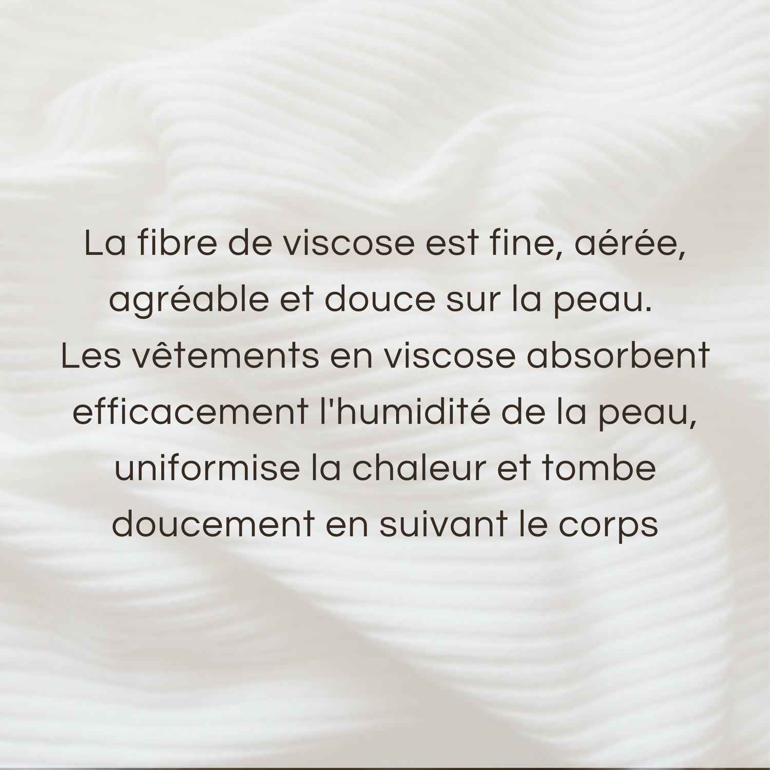 La fibre de viscose est fine, aérée, agréable et douce sur la peau. Les vêtements en viscose absorbent efficacement l'humidité de la peau, uniformise la chaleur et tombe doucement en suivant le corps. Grâce à la surface brillante et uniforme de la fibre, les couleurs des produits en viscose sont éclatantes.