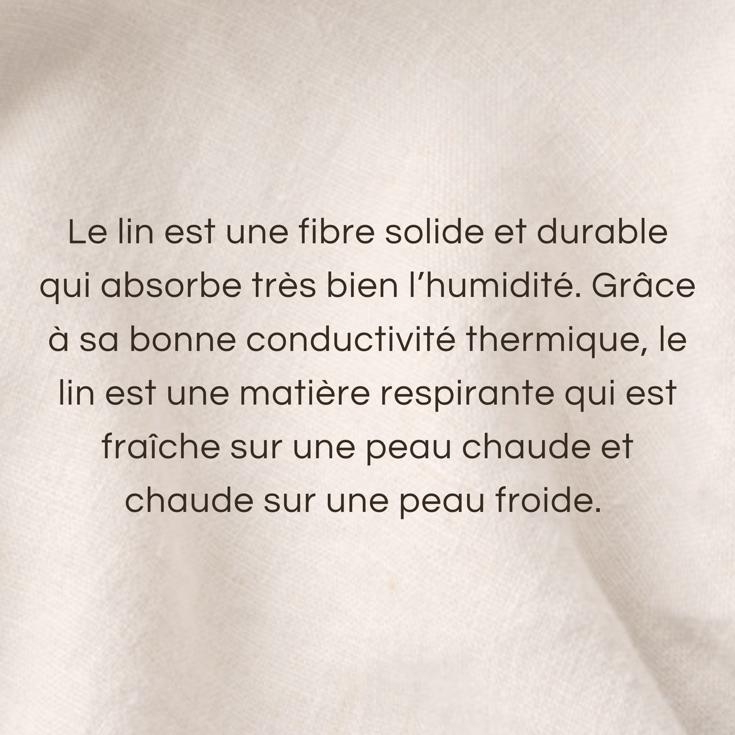 Le lin est une fibre solide et durable qui absorbe très bien l’humidité. Grâce à sa bonne conductivité thermique, le lin est une matière respirante qui est fraîche sur une peau chaude et chaude sur une peau froide. Il est très résistant aux rayons UV et ne s’électrifie pas facilement. La fibre de lin est brillante et a une surface lisse. Même si le lin est beau et agréable au toucher, c'est aussi un matériau pratique. Le lin est également antibactérien, il n’irrite donc pas même les peaux sensibles.