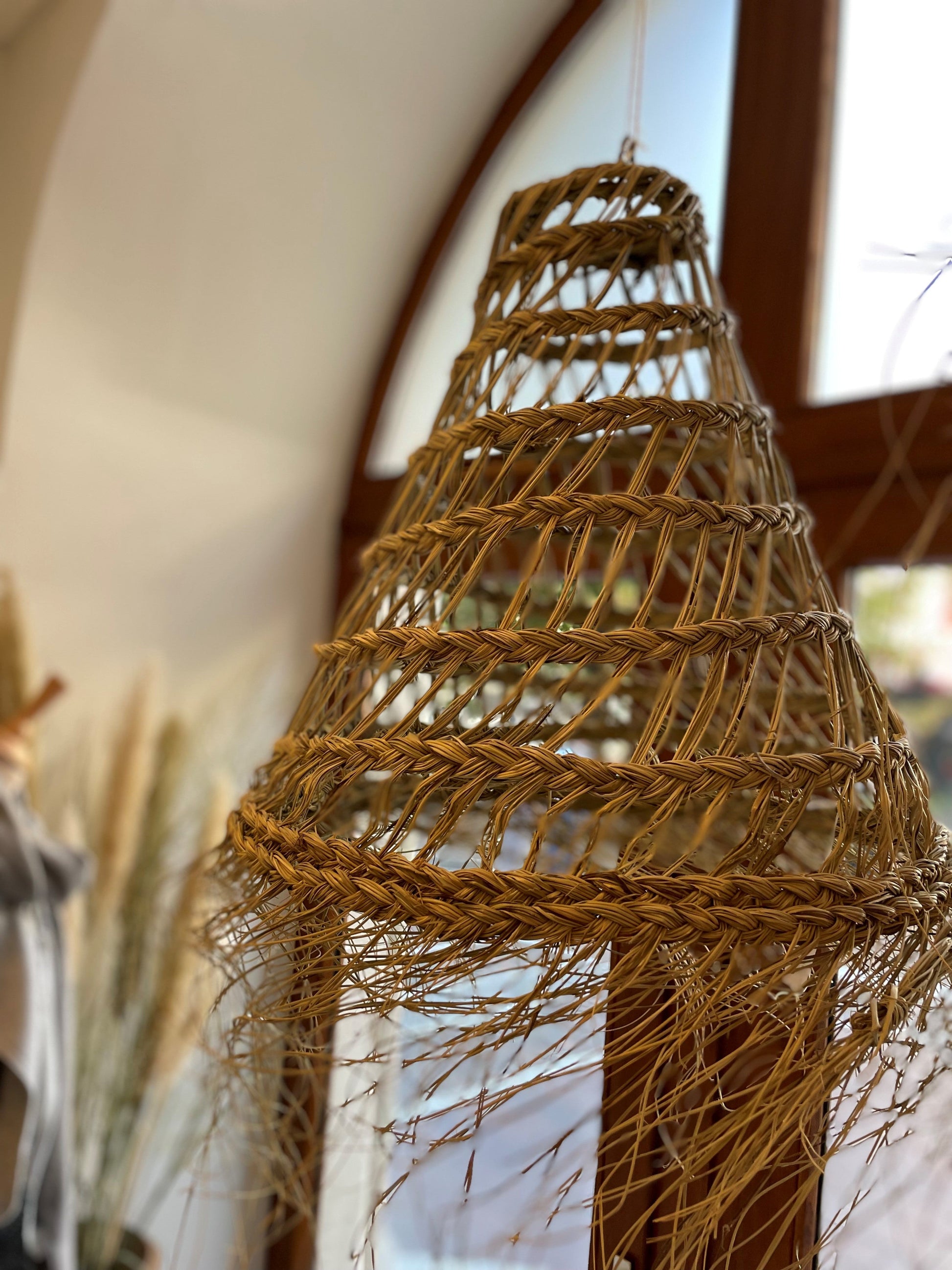Cet abat-jour est tissé à partir de feuilles de palmier naturel. La tresse lâche s'ouvre vers la fin en une frange décontractée, ce qui crée un look léger et amusant pour la lampe. Les ouvertures dans l'abat-jour créent de belles ombres dans l'espace. Un crochet adapté à la fixation est tissé dans l'abat-jour.